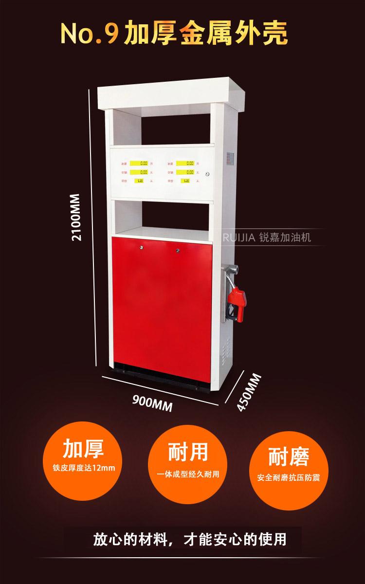 锐嘉大型加油站汽油加油机210型是一款防爆加油机,可加柴油和汽油,750W大功率,流量每分钟可达60L-80L,加油机内部采用正星同款流量计和防爆组合泵装置,安全更放心!